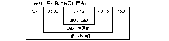 3.馬克隆值分級。馬克隆值分三個級,即A、B、C級,B級為馬克隆值標準級(見表四)。