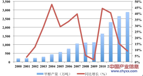 ??我國甲醇行業自2002年進入快速發展期,產量持續上漲。2011年-2013年全國甲醇產量分別為2,294.50萬噸、2,640.46萬噸和2,878.54萬噸,2012年較2011年同比增長15.08%,2013年較2012年同比增長9.02%。